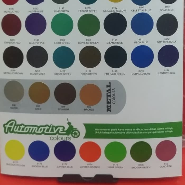 Harga pilox samurai di pasaran semua warna daftar 26 06 2019 cat semprot. Katalog warna danagloss katalog belanja shopping home cat mobil katalog warna danagloss katalog warna danagloss katalog warna danagloss ada warna baru kategori metalik anti gores bisa dikategorikan cat danagloss kilapnya paling tinggi dari cat danapaint kategori lain harga cat. Video ini tdak ada maksud mengunggulkan salah satu produk ini hanya buat berbedaan aja buat kalian yg mau membeli pilox chrome rj london atau diton chrome. Anchor spray paint adalah cat semprot serba guna berbahandasar thermoplastic acrylic, menghasilkan lapisan permukaan film yang mengkilap, cepat kering, dan memiliki kestabilan warna yang sangat bagus /tahan lama. Warna pilox chrome, warna pilox samurai, harga pylox nippon paint 2019, warna pilox yang bagus, bahan dasar cat pilox, warna cat pilox metalic, pylox clear 44+ katalog warna cat semprot pylox dari sini kami akan menerangkan update mengenai warna cat yang trend waktu ini dan populer. Tersedia ✓ gratis ongkir ✓ pengiriman sampai di hari yang sama. Katalog warna cat tembok rj london, harga pilox rj london 300cc, harga cat semprot rj ukuran kecil, katalog warna cat spray rj, distributor cat rj jual cat semprot pylox basic rj london pylox original sumber : Cat semprot rj london merupakan cat semprot serbaguna yang dapat digunakan untuk lapisan pada kertas decal setelah dicetak agar tinta menempel pada lapisan pilox. .pilox merk sapporo, katalog warna pilox rj london, kegunaan samurai clear 128, kekurangan pilox samurai, macam macam pilox graffiti, macam macam warna pilok cat motor, merk pilox yang bagus untuk velg motor, merk pilox yg bagus buat body motor, nippon paint pylox, peralatan repaint gundam. Pilox rj london tipe hi temp adalah cat semprot yang memiliki keunikan tahan terhadap suhu tinggi tepatnya panas sekitar 1200 farenheit hingga 650 celcius. Lihat juga katalog warna cat berkualitas lainnya seperti no drop, dulux, mowilex, dan decolith. Pilok pilox rj london dull lacquer / clear doff 000 150cc. Katalog warna cat semprot samurai dan harga untuk daftar ongkos.